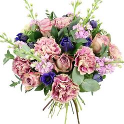 Delight your loved ones with our enchanting and unique flower bouquet. This stunning arrangement includes a charming mix of roses, carnations, veronica, asters, and lisianthus, enhanced with trachelium, ruscus, and fragrant eucalyptus foliage.