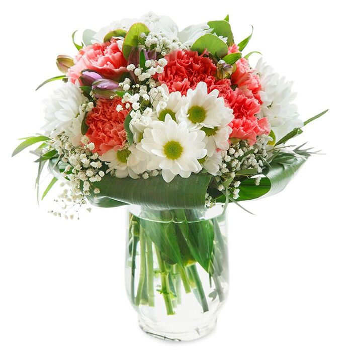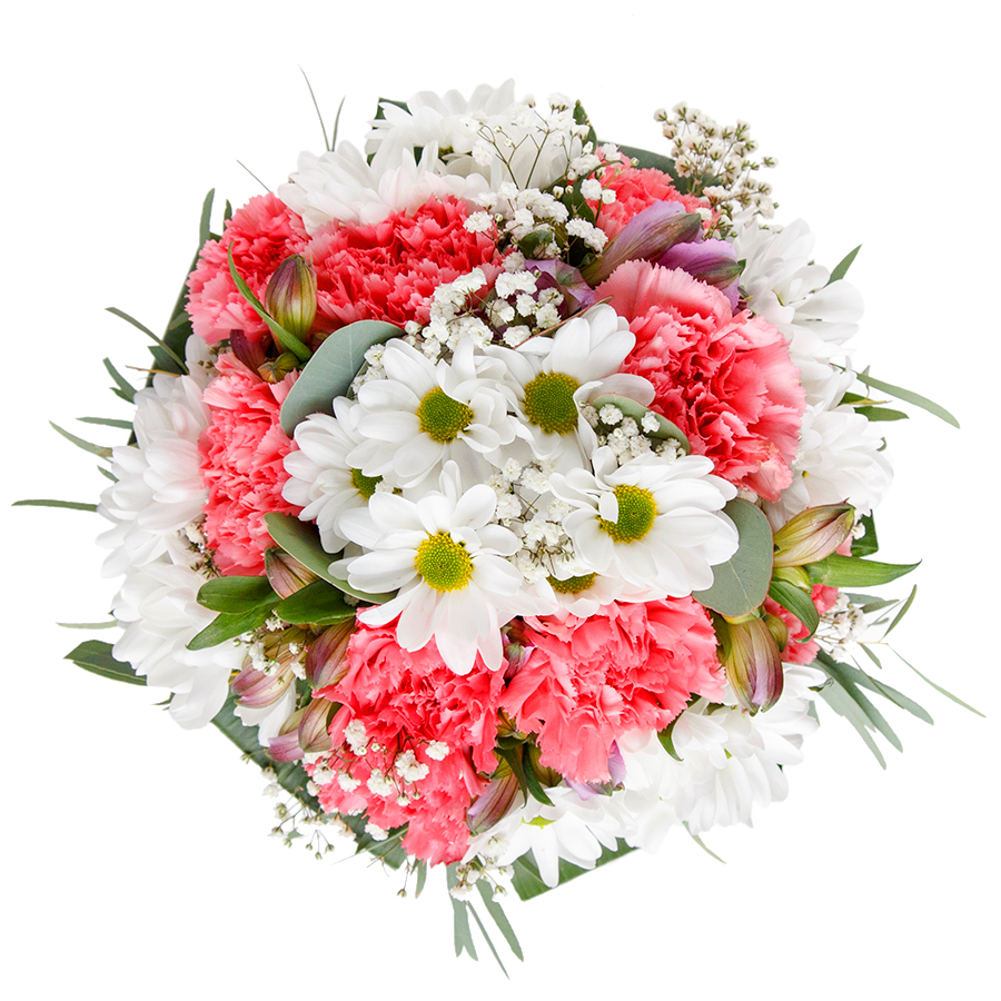Immerse yourself in the beauty and uniqueness of our seasonal flower arrangement. This stunning bouquet features a harmonious blend of snow-white chrysanthemums, delicate gypsophila, and soft light pink carnations, elegantly wrapped in rich aspidistra leaves.
